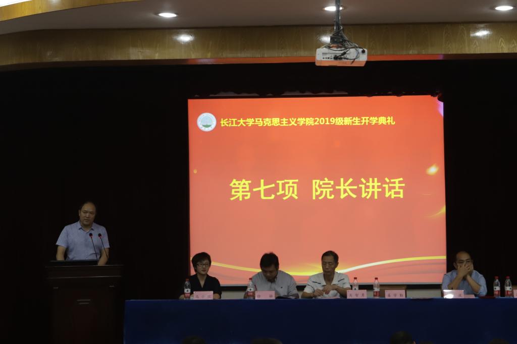 姜学勤院长对全体新同学的到来表示欢迎和祝贺,他希望同学们了解大学使命,回望马院初心,迎接美好未来,并向大家提出了“明德、不惑、不忧、不惧”四点建议。
