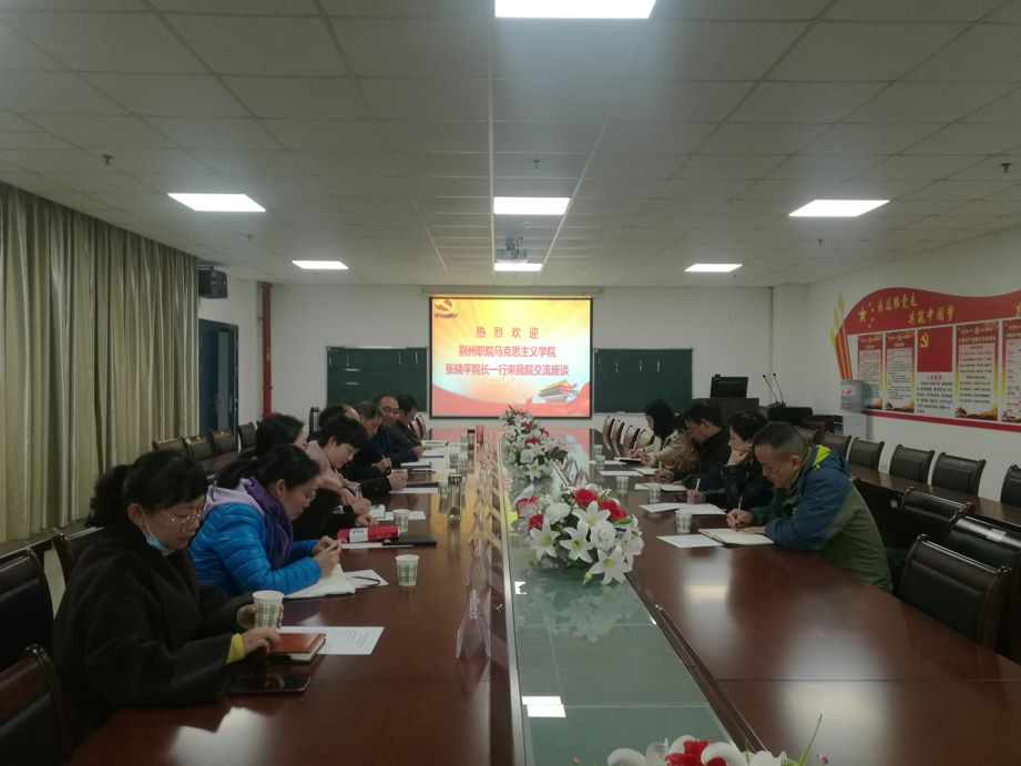 姜学勤院长首先介绍我院基本情况、机构设置、教学科研平台、经典文献阅览室以及虚拟仿真实验室建设情况等。张晓平院长介绍了荆州职业技术学院suncitygroup太阳集团网址基本情况,重点介绍了红色公园党史长廊、中国精神长廊、湘鄂西革命档案史料馆。两校在思想政治教育上各有特色,双方指出以后可以在很多方面开展更加丰富的交流与合作。