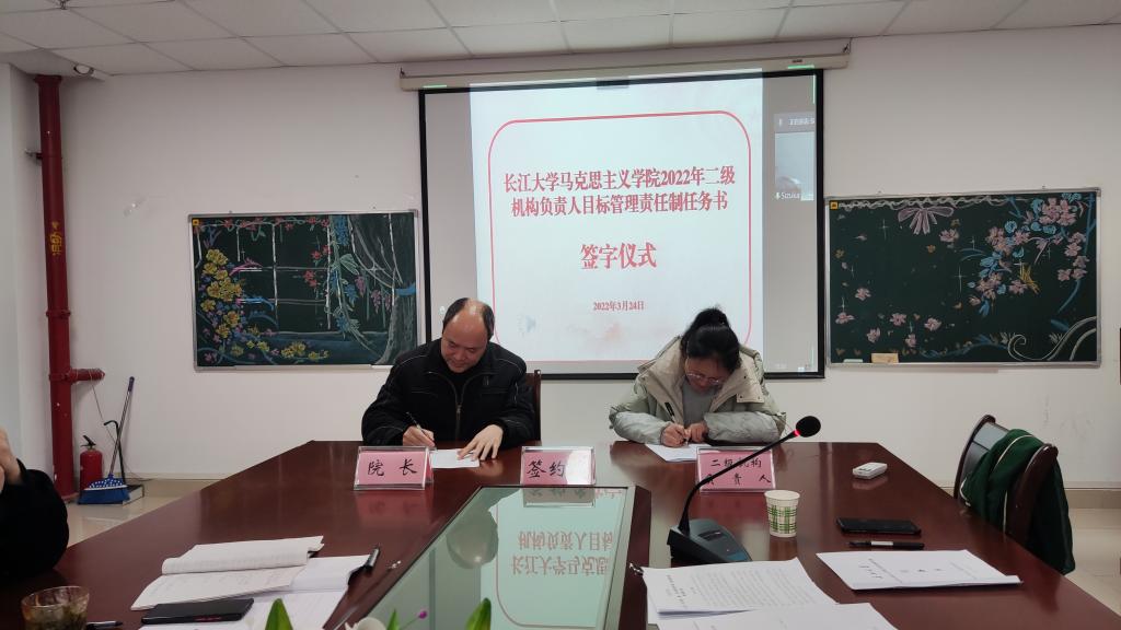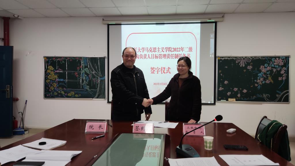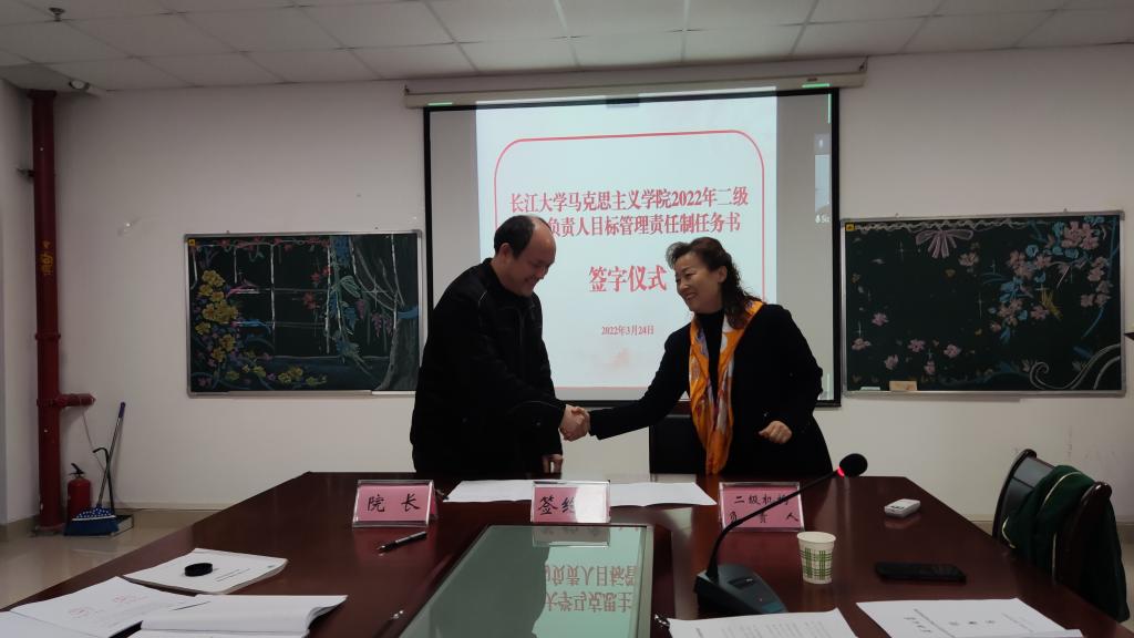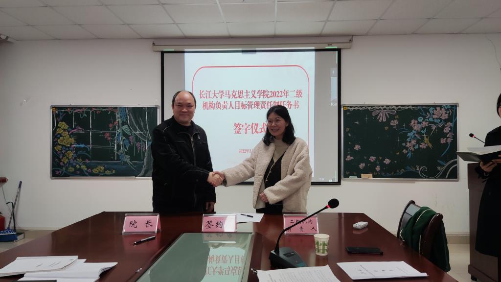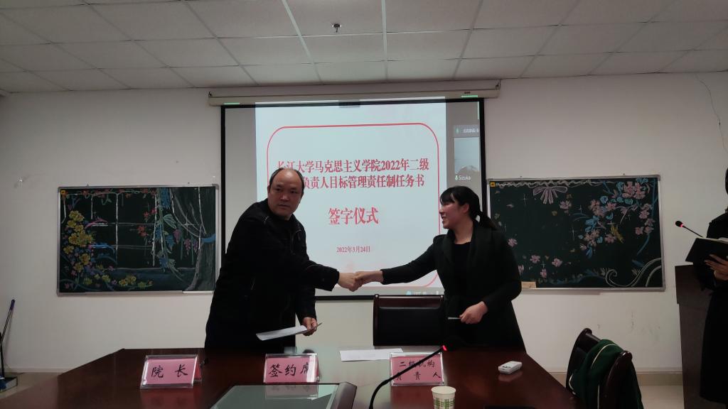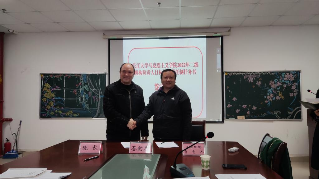在宣讲了各二级机构的基础工作、主责任务和发展性指标考核任务清单后,院长姜学勤当场与“生命长江”教研室、虚拟仿真教学体验中心等2个特色教学机构,党史党建研究所、廉洁建设研究中心等6个特色科研平台,马原、纲要、思修等5门公共课教研室,学工办、团委、院办等5个行政管理机构,以及政治系和研究生思政课教研室等3个专业教学机构,共21个二级机构负责人签订了目标管理责任制任务书。