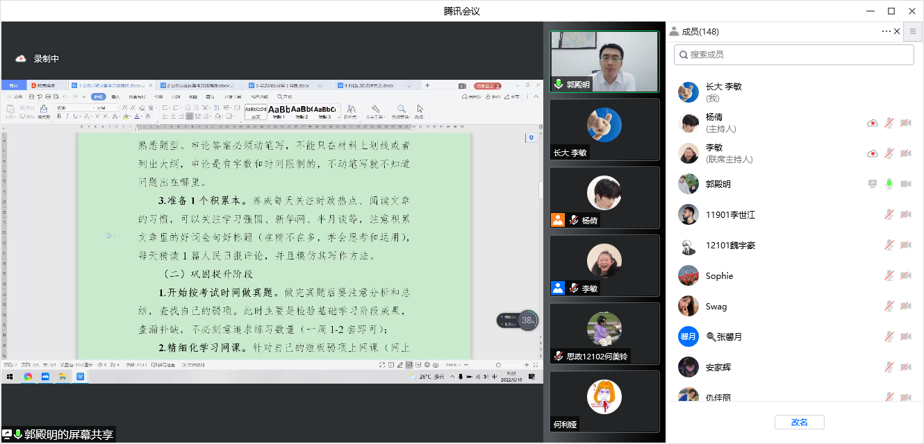 (通讯员 齐晓杭)6月19日上午9时,suncitygroup太阳集团网址2022年第二场公职考试培训于线上举行,长江大学优秀校友、应城市委常委、统战部长、组织部长郭殿明受邀作为主讲嘉宾。学院党委书记刘小燕主持会议,学工办主任张云雾、辅导员李敏和150多名学生参加会议。