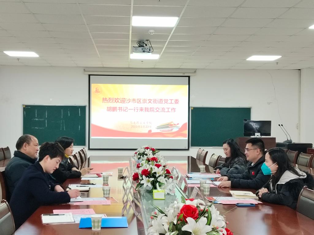 为加强校地合作,2月23日上午,沙市区崇文街道党工委书记胡鹏等一行3人到访我院洽谈交流,学院院长姜学勤、党委书记刘小燕、党委副书记马小佼参加了交流会。