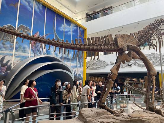 进入博物馆,首先映入眼帘的是一块超大的遗迹化石幕墙。在讲解员的解说下,师生们详细观摩了这块由60多块“龙”足迹和鱼类游泳迹拼接成的、生动展示两亿多年前动物间追逐场景的化石幕墙。