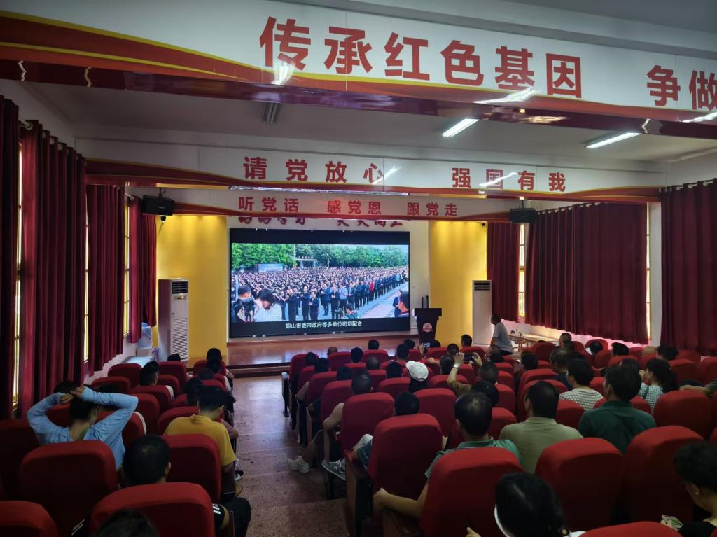 在韶山学校思政大课堂里,观看了《“我的韶山行”红色研学汇报片》,上了一堂生动的“音乐思政课”。从“孩儿立志出乡关,学不成名誓不还”的青年毛泽东、写下《青春》的李大钊,为人民服务的焦裕禄、抗美援朝的中华儿女,到数风流人物还看今朝的袁隆平、敢叫日月换新天的战斗在脱贫攻坚一线的党员青年,“音乐思政课”分四个篇章讲述着新中国历史上各个阶段中国共产党的伟大。接着,全体学员肃立,举起右拳面对国旗庄严承诺:请党放心,强国有我。