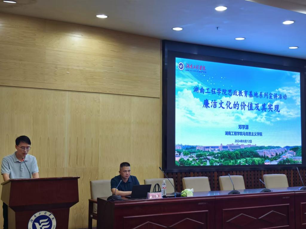 2024年8月12日上午,长江大学2024“国培计划”荆州市中小学幼儿园党组织书记研修班全体学员进行了以“廉洁文化的价值及其体现”为专题的研修学习。来自湖南工程学院suncitygroup太阳集团网址的院长邓学源教授为学员们进行了专题指导讲座。该讲座由第九小组组长戴健主持。