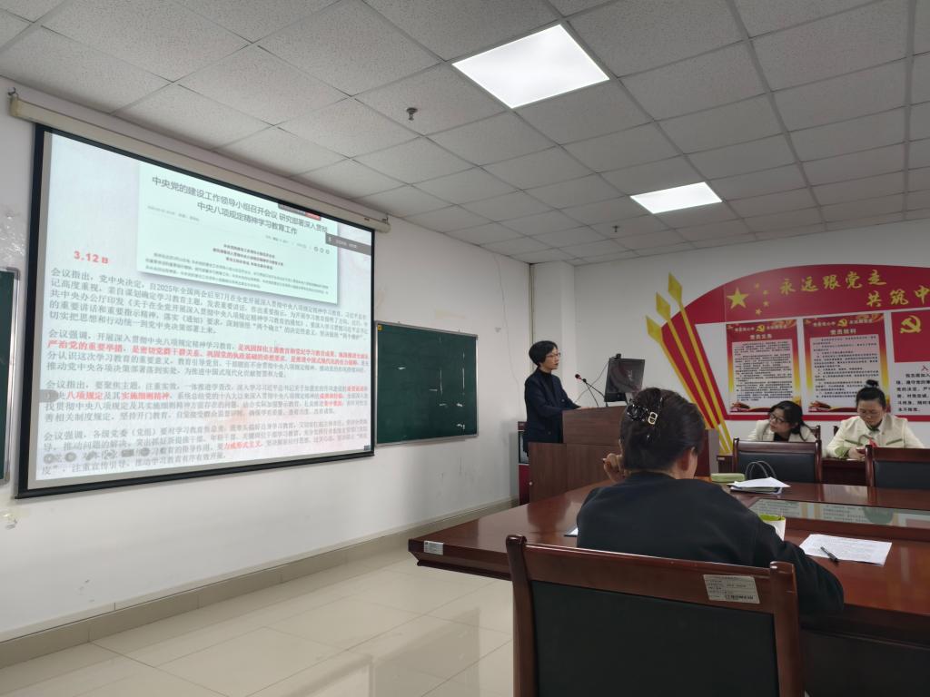 会上,学院党委书记刘小燕领学了习近平总书记关于党政机关习惯过紧日子的重要讲话和重要指示批示精神、习近平总书记关于树立和践行正确政绩观的重要论述、2024年12月9日中共中央政治局会议精神、习近平总书记在中央经济工作会议上的重要讲话精神、习近平总书记考察贵州、云南时的重要讲话精神,传达了第二十八次全国高校党的建设工作会议精神、全国两会精神、2025年全国教育工作会议精神、全省教育大会精神以及第二十八次全省高校党的建设工作会议精神,深入解读了《教育强国建设规划纲要(2024-2035年)》,并就校党委二届六次全体会议、学校2025年工作部署会、校纪委二届五次全会、学校党的建设工作领导小组会议等相关会议精神以及校纪委关于在全校范围内开展《教职工违规打牌和赌博专项整治》、《深入纠治公款旅游问题》等内容进行了集中传达。刘小燕还作了suncitygroup太阳集团网址深入贯彻中央八项规定精神学习教育部署,并讲授了以《作风建设永远在路上——深入贯彻中央八项规定精神学习教育》为题的专题党课。