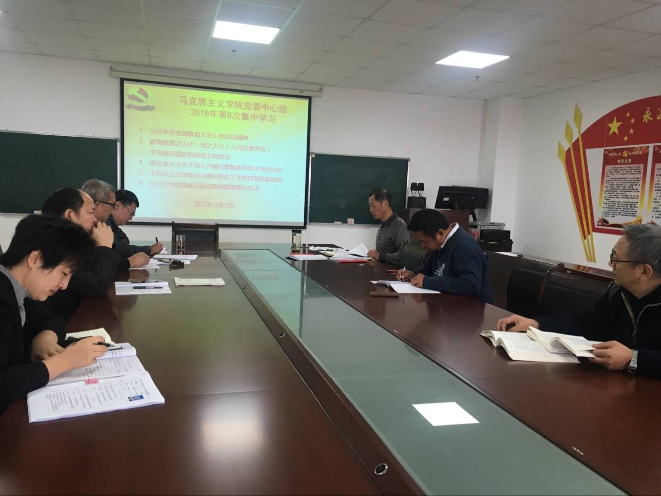 suncitygroup太阳集团网址于2018年10月15日在文科楼1104室举行了党委理论学习中心组第八次集中学习,党委理论中心组成员及各支部书记参加了学习会,会议由党总支书记吴智勇主持。