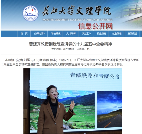 11月5日,学院党委副书记马小佼领学了十九届五中全会公报,全院学生党员、入党积极分子、学习小组成员共同参会;11月8日,学院组织各支部书记参加学校基层党组织书记集中培训,共同聆听了武汉大学项久雨教授所做的《中国道路的未来——十九届五中全会精神解读》;11月10日,学院召开了党委理论中心组集中学习暨党委扩大会,吴智勇书记领学了十九届五中全会精神;11月13日,学院组织开展全院教职工政治学习,全体教师共同学习了全会精神,院长姜学勤为与会人员上了一堂了题为《擎画新蓝图 开启新征程——党的十九届五中全会精神解读》的专题党课;11月12日至11月13日,学院党委书记、院长带头学习了全国教育系统党的十九届五中全会精神宣讲报告会、中央宣讲团成员在湖北高校的宣讲报告;12月3日,校党委书记朱业宏为我院科级以上干部做了十九届五中全会的专题宣讲;12月4日,湖北省委宣讲团成员、武汉纺织大学suncitygroup太阳集团网址院长金艳来校宣讲十九届五中全会精神,全院思政课教师参会;12月10日,荆州市委宣讲团成员、我院涂江波副院长为全院师生宣讲了全会精神。此外,我院贾廷秀、卢军等教师作为荆州市委宣讲团成员,还先后受邀为长江大学文理学院、市科协、市侨联、市工商联、市残联等校内外单位进行了理论宣讲。全院学生也通过“支部主题党日”、主题团会等形式开展了专题学习。
