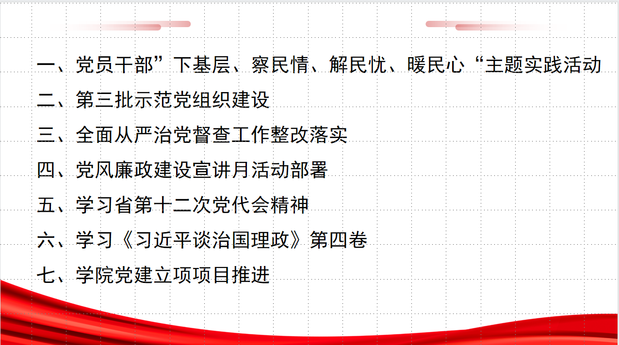 如何有效抓落实?姜院长提出了三点建议:一是要履职尽责,注重工作规范,确保规定动作不走样;二是要统筹兼顾,创新工作方式方法,提升工作效率;三是务求实效,要用发展的成效检验党建工作实效,力争学院工作有突破、创品牌。
