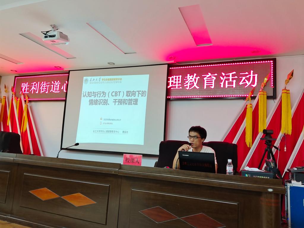 此次培训是由我校心理咨询中心专职心理咨询师曹国光受邀主讲。他从认知与行为疗法的工作原理、情绪的识别和命名、认知重建技术、行为改变技术四个方面讲授,课间还带领大家一起做了放松体验,引导学员进行适当的心理调适和压力应对。