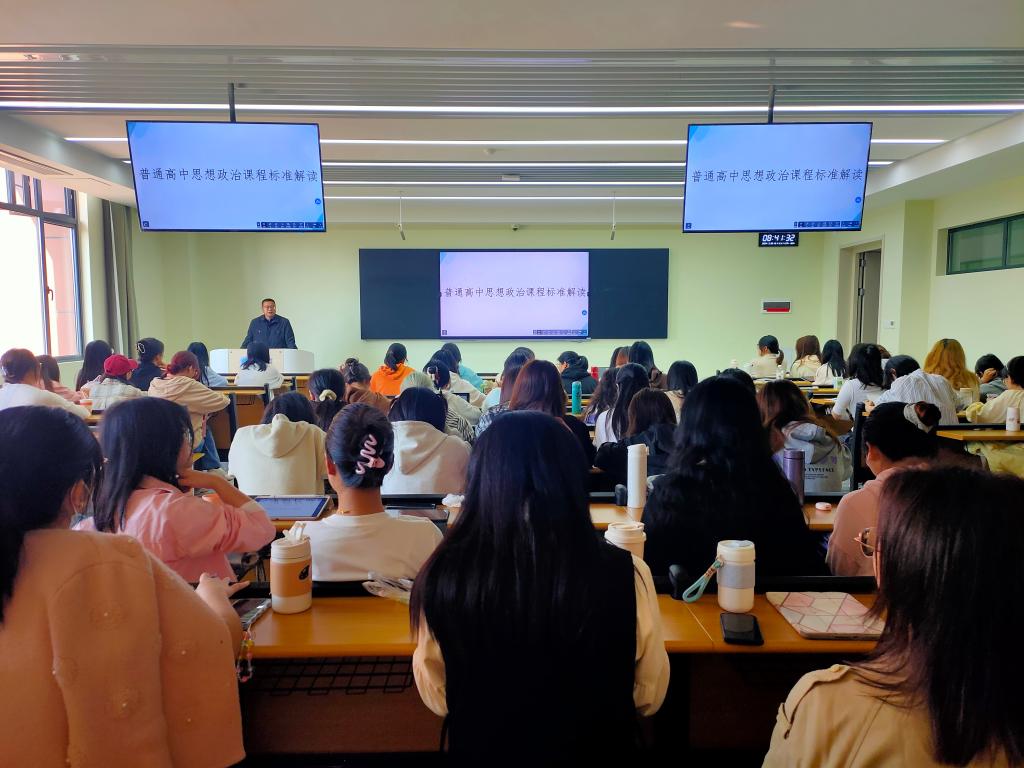 本次讲座主题为“普通高中思想政治课程解读”,李老师结合实际案例和相关经验,从课程性质与基本理念、学科核心素养与课程目标、课程结构 、课程内容、学业质量、实施建议等六个方面,围绕政治认同、科学精神、法治意识、公共参与四个核心素养,对新版高中思想政治教材进行了详细解读。针对课堂设计,他强调,思政课要彰显“人”,通过情景式教学,营造“互动、参与、开放”的人气味课堂氛围。同时,他估计同学们要不断提升自身综合素质,育德于课,人文立课。