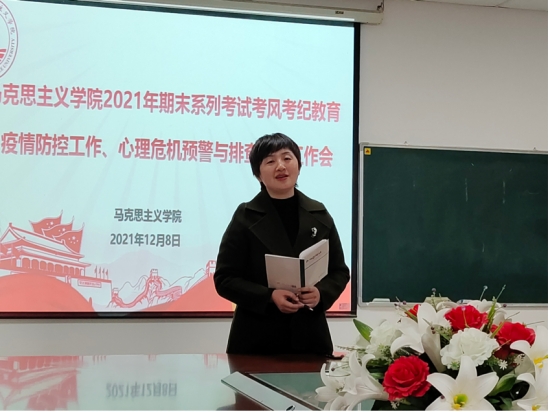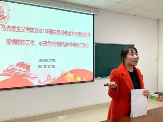 (通讯员、摄影:齐晓杭)12月8日下午6时,suncitygroup太阳集团网址在文科楼1104室召开期末系列考试考风考纪教育及疫情防控工作会议,本次会议由学工办主任张云雾主持,学院党委副书记马小佼、辅导员李敏出席会议。本研各班级的班长、团支书、副班长兼安全委员、心理委员及学生会、研究生会主要成员到场参会。