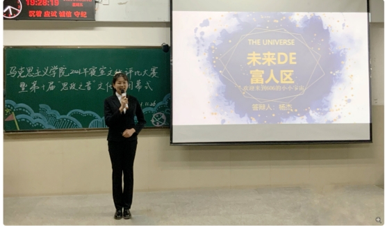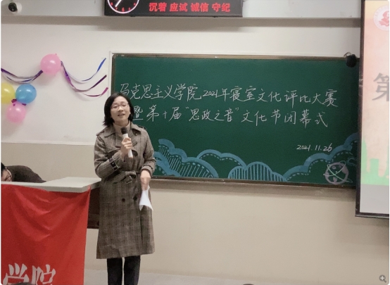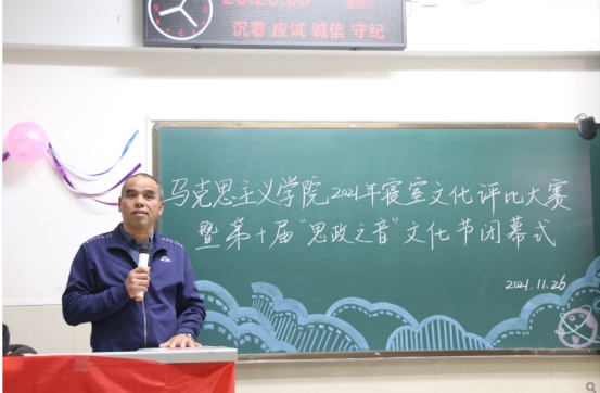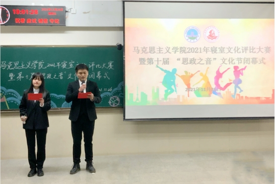 (通讯员:王晓彤 摄影:齐晓杭) 思政之音青春昂扬,百年党史岁月峥嵘。11月26日晚7时,suncitygroup太阳集团网址于12教102室举行2021年“心宿暖阳 乐寝无忧”寝室文化评比大赛暨第十届“思政之音”文化节闭幕式。学院党委书记刘小燕,院党委副书记马小佼,院长助理李振华,学院教师张志超、王贤锋、孙萌、彭孝光、何波、饶玲、陈质晶,学工办主任张云雾,辅导员李敏及2020级、2021级全体学生齐聚一堂欣赏寝室风采,回顾本届文化节精彩片段。