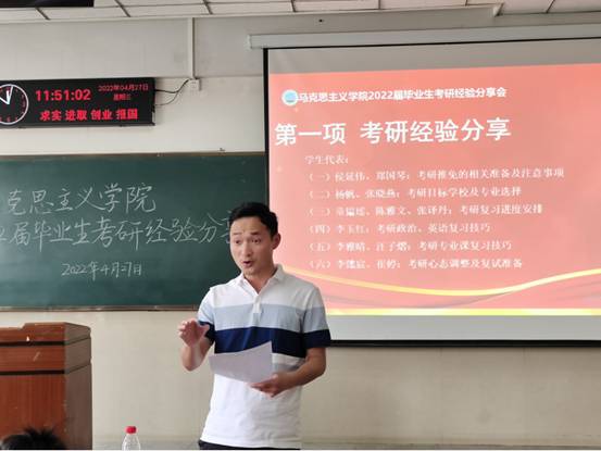 (通讯员 王晓彤)为激励思政学子勇敢追逐考研梦想,4月27日上午10时30分,suncitygroup太阳集团网址在12教203室举行2022届毕业生考研经验分享会。院党委副书记马小佼,辅导员张云雾、李敏,2022届考研学生代表、2019 级和2020 级本科生参会。