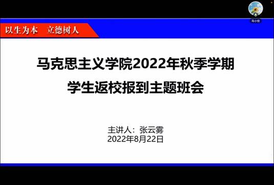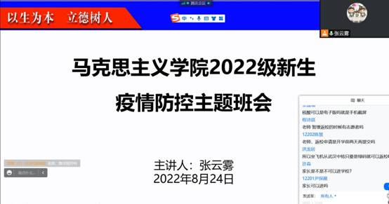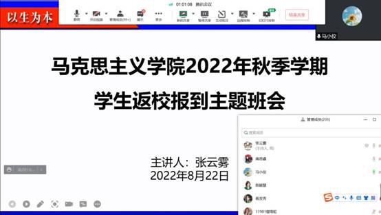 (通讯员:齐晓杭 摄影:龙薛西)为有序做好秋季返校报到工作,讲清疫情防控政策,suncitygroup太阳集团网址2022年秋季学期学生返校报到主题班会于8月22日-8月25日通过腾讯会议线上召开,辅导员张云雾老师、李敏老师分别面向本、研学生进行了宣讲,学院党委副书记马小佼线上参会。