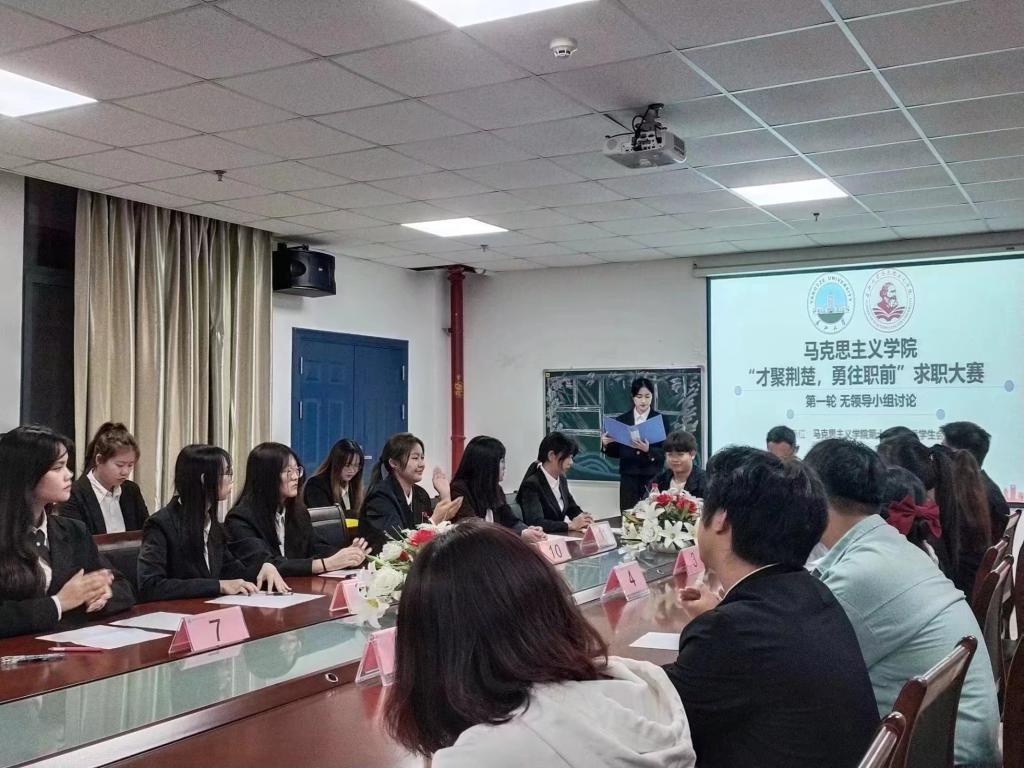 (通讯员 周芯如)为深入贯彻习近平总书记考察湖北重要讲话精神和省第十二次党代会精神,帮助大学生树立正确的择业观,提升求职能力,9月25日晚7时,suncitygroup太阳集团网址于文科楼1104室举办“才聚荆楚,勇往职前”求职大赛初赛。初赛以无领导小组讨论赛的形式选拔,就业专干李敏、团委学生会负责人王晓彤、郢都论坛负责人张李蔚、修远班负责人李周翊涵、慕晨辩论队负责人陈嘉锐任活动评委。