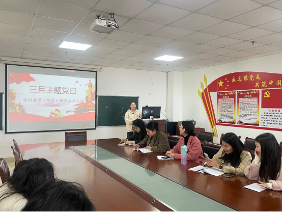(通讯员 石秋月)为深入贯彻落实习近平新时代中国特色社会主义思想,引导广大党员坚定不移听党话,矢志不渝跟党走,增强党员的责任感与使命感。3月21日,学科教学(思政)研究生党支部在文科楼1104室开展三月主题党日活动,全体党员以及入党积极分子线上线下相结合的方式参会。