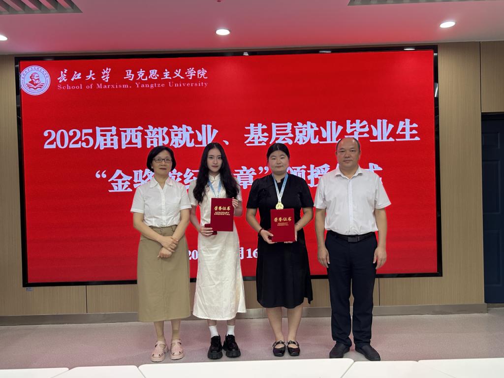 会上,姜学勤院长、刘小燕书记共同为西部就业、基层就业学生代表仇佳丽、许惠宁颁发“金骆驼纪念章”。围绕职业选择时的所思所想,毕业生们畅谈了感悟。许惠宁同学讲述了自己在校期间以学为主、全面发展,毕业时决心回到家乡广西,立志投身教育事业的心路历程;仇佳丽同学提到,在学习成长过程中,国家、社会和学校对她的关怀从未间断。作为一名学生党员,她将秉持全心全意为人民服务的宗旨,在基层岗位上贡献青春力量,以实际行动报效祖国。
